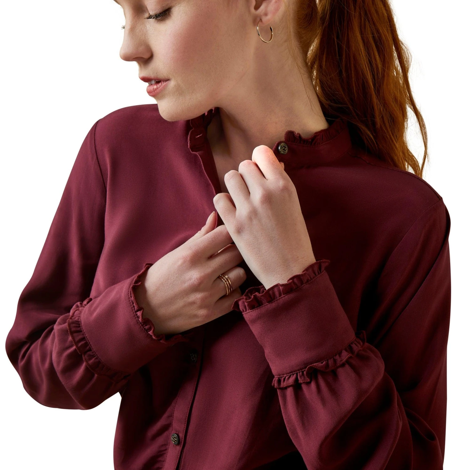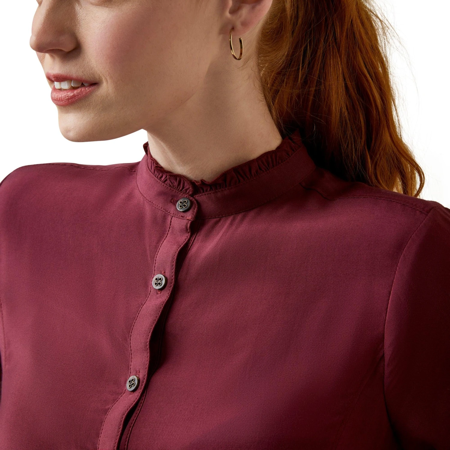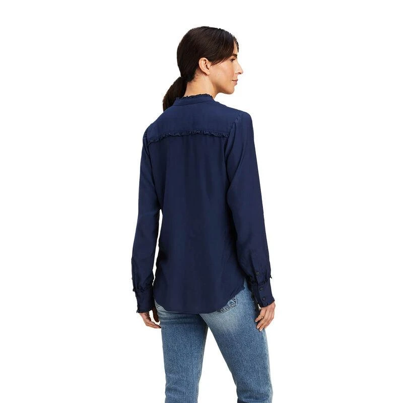 Constructed of a light, silky twill with a feminine mock neckline, the Clarion is the epitome of countryside elegance. Equally fitting when worn for coffee with friends or a festive dinner, there is no wrong place to wear it.