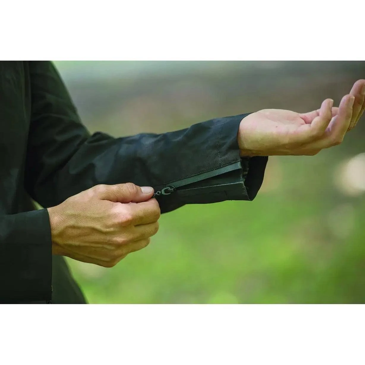 INCLUDES Zippered vents at the cuff, self-sealing exposed zipper pockets, hidden self-sealing zip front behind 4 black snaps, double back vent