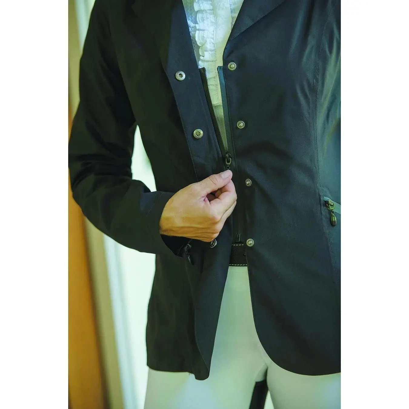 The FITS black Hydra water-proof show coat will keep you dry all year round with fully taped seams, a special self-sealing zipper, 4 black snaps, and a double vented back. Made from a soft shell outer layer- this jacket will shed all dirt, hair, and shavings.