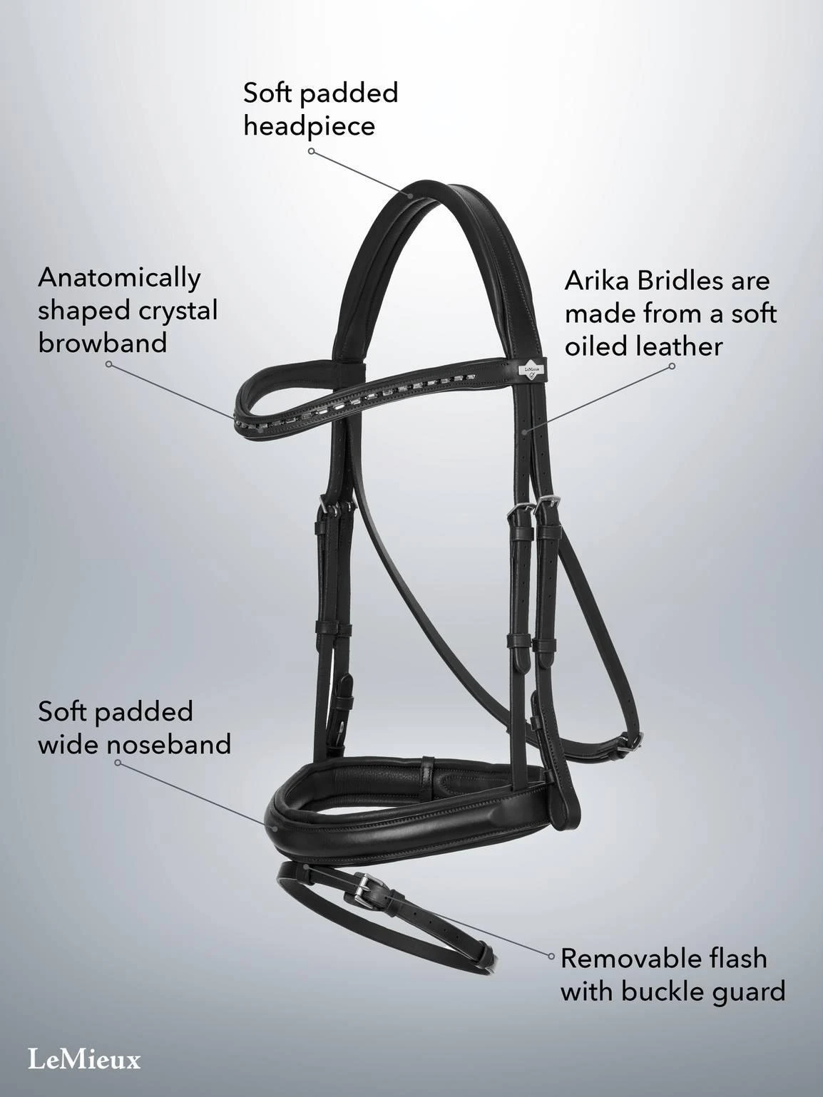 Our Arika Dressage Bridle strikes the perfect balance between style and function. Made for the ring, the anatomically shaped browband features black crystals for an extra special look that will beautifully complement your dressage outfit.