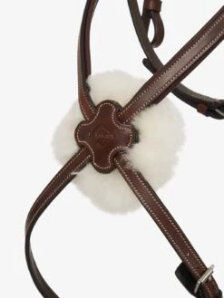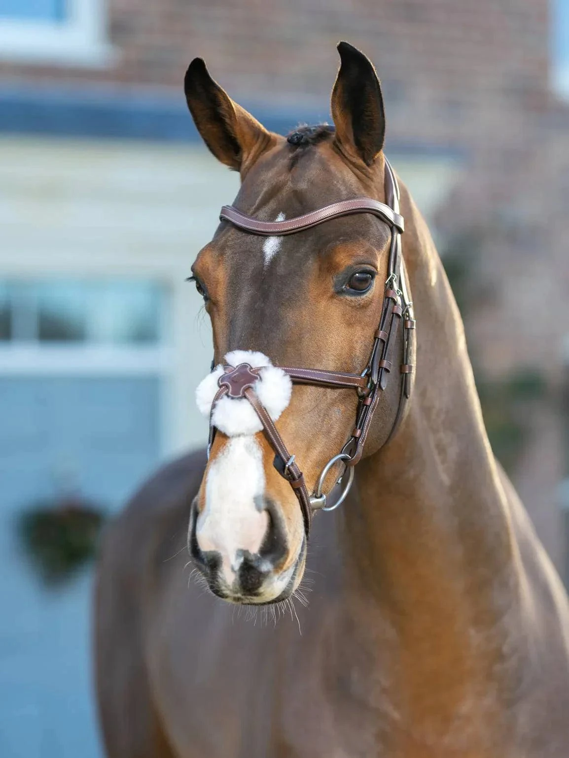 A D-ring joins the noseband and cheek pieces, allowing the it to sit smoothly against the horse’s cheeks and jaw. This helps to provide a tailored fit for different jaw shapes and the back strap can move independently.