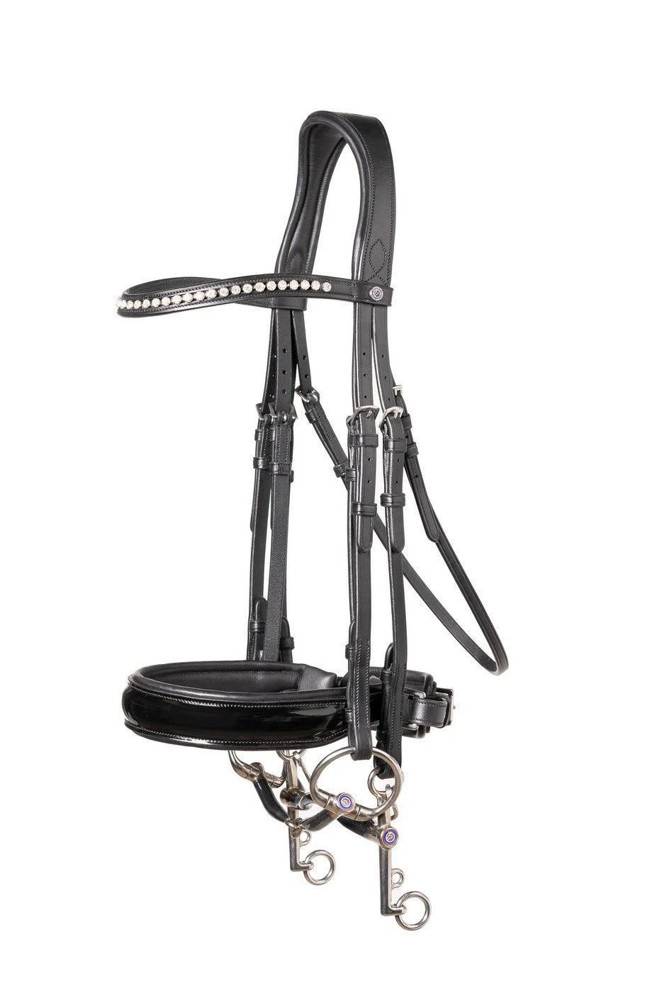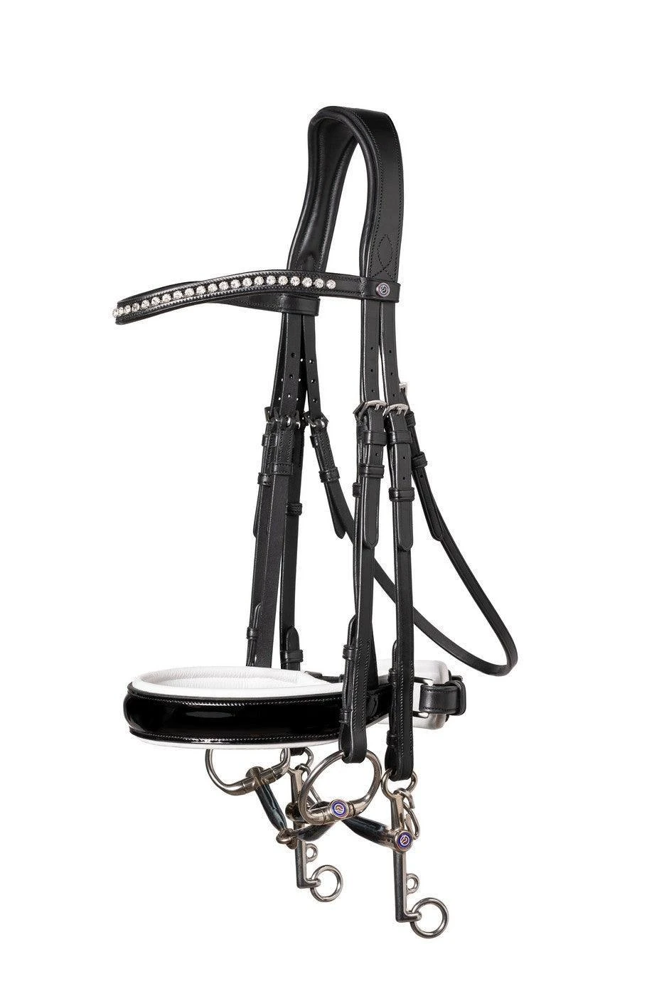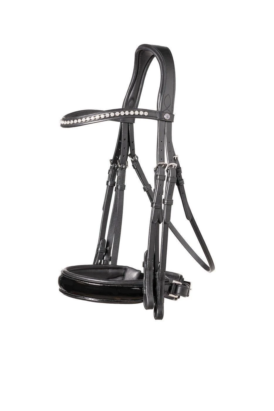 The snaffle bridle TRUST Aachen is in a class of its own. The stylish bridle has a beautiful finish and a nice fit. The TRUST Aachen has a patent leather and anatomical crank noseband that is reinforced with nylon to prevent stretching. The noseband padding continues beyond the noseband so that the buckles can never touch the horse’s head. The browband is fitted with the purest quality Stellux™ stones, which ensures an elegant appearance. These stones are deep-set, so they do not fall out. The headpiece is anatomically shaped and cut back for more freedom at the ears.The padding of the headpiece is soft but not too thick, so that there is direct contact with the horse.The TRUST Aachen is a must-have bridle for the dressage rider!