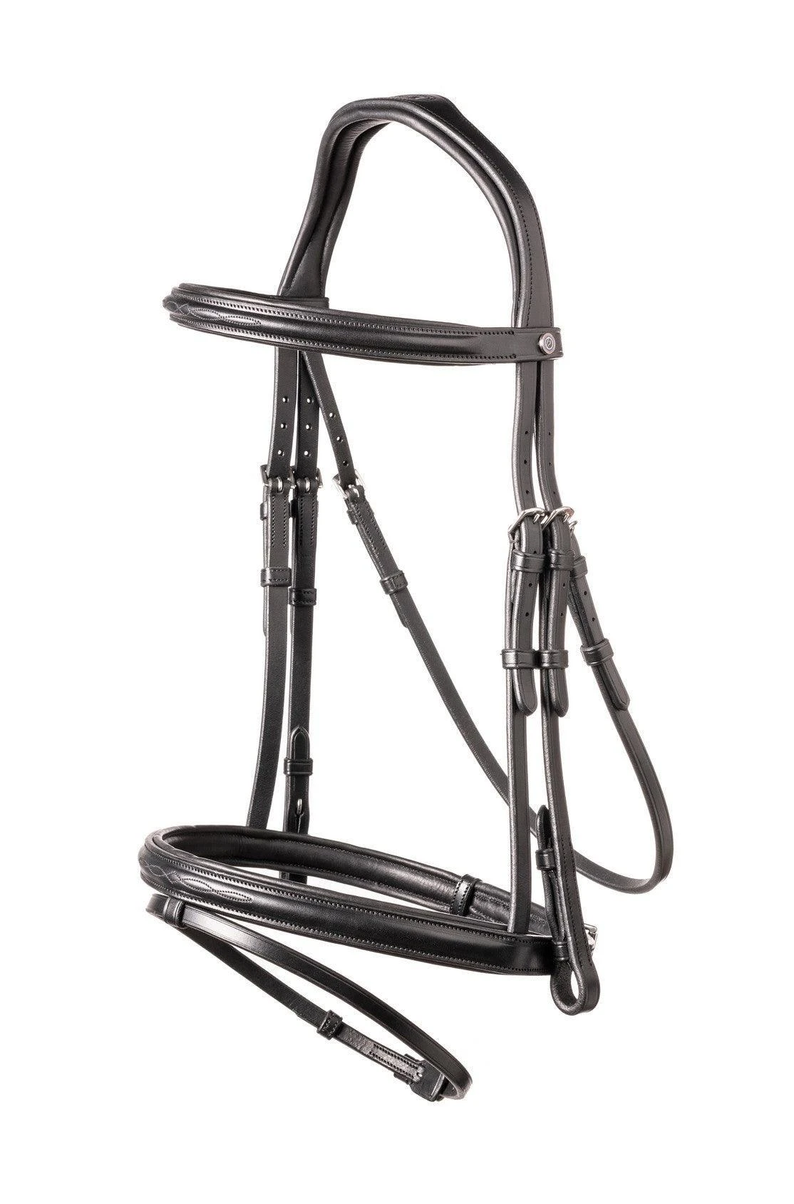The TRUST Calgary bridle is a very functional and beautiful bridle. This bridle has a combined noseband with a buckle protector. The TRUST Calgary bridle has a straight browband. Both the browband and the noseband have decorative stitching, which creates a beautiful effect The noseband has 3 mm padding and the browband is also softly padded. The headpiece is anatomically shaped and cut back for more freedom at the ears. The padding of the headpiece is soft but not too thick, so that there is direct contact with the horse. .