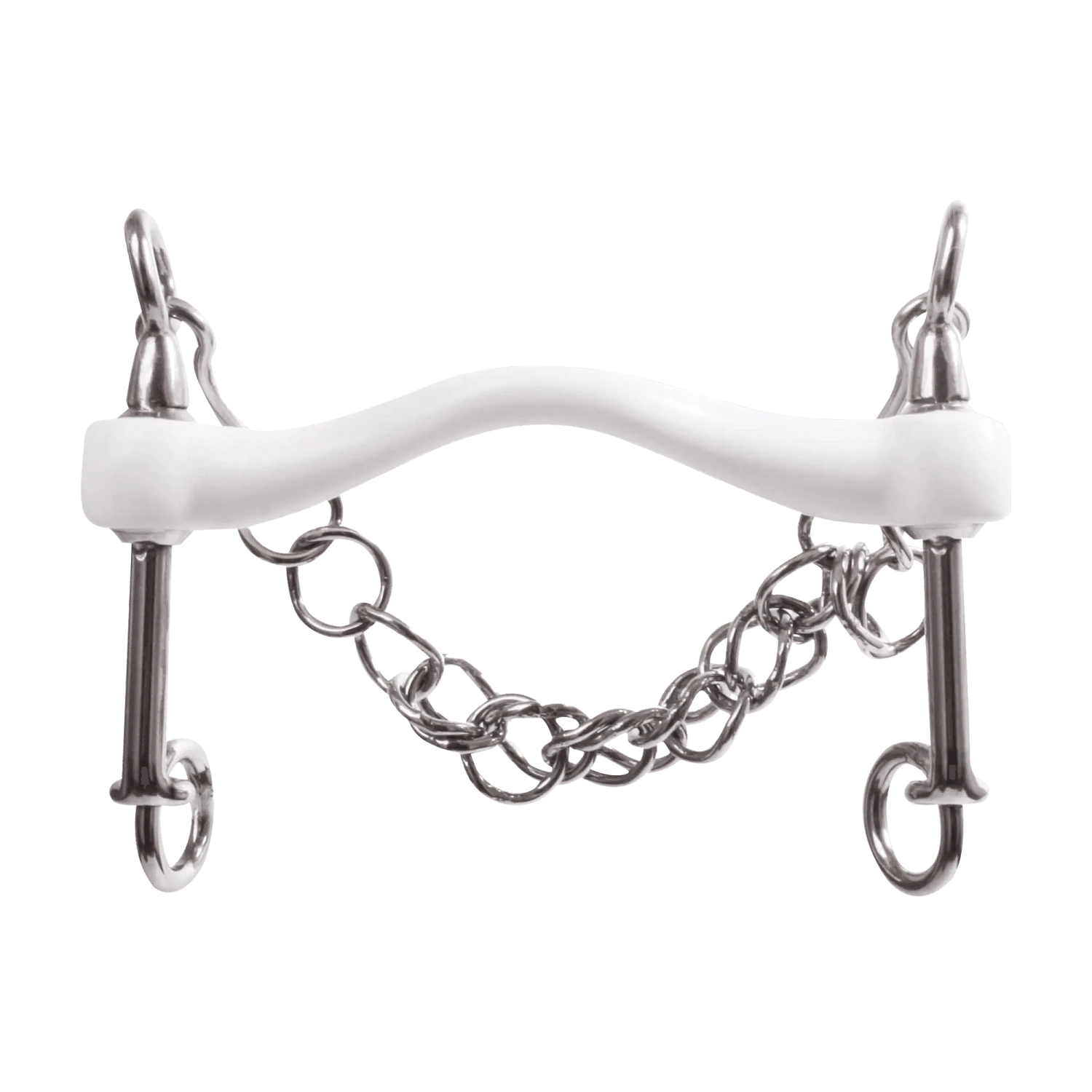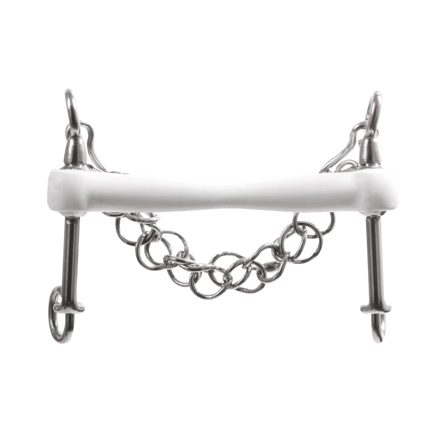 The Inno Sense Mullen is a straight bar that slightly bends forward. This mouthpiece is fabricated of synthetic material. The bit has a rigid core that makes the mullen bar not flexible but the material around it gives the bit a soft touch.