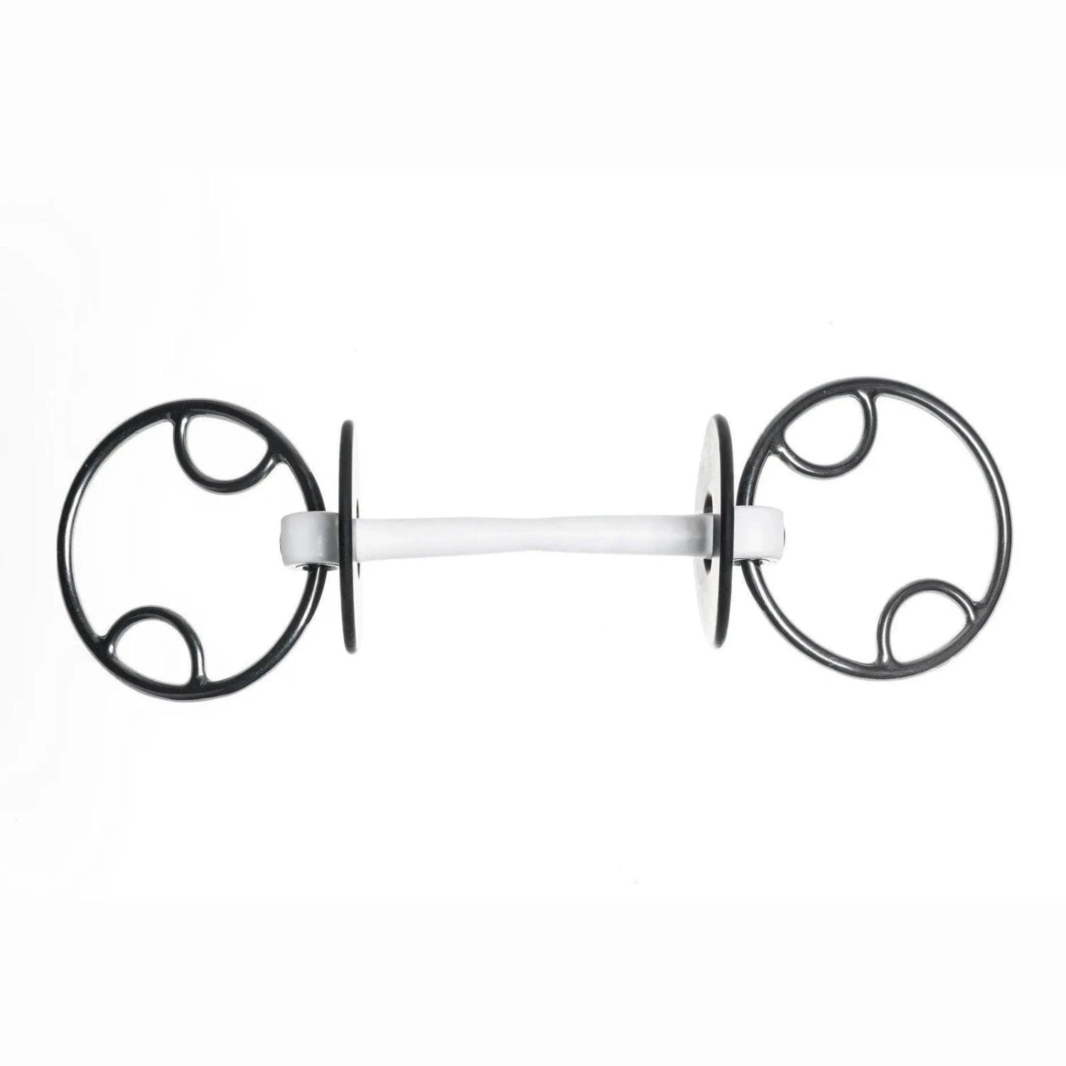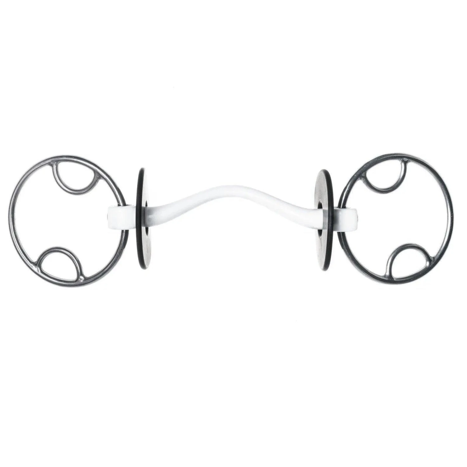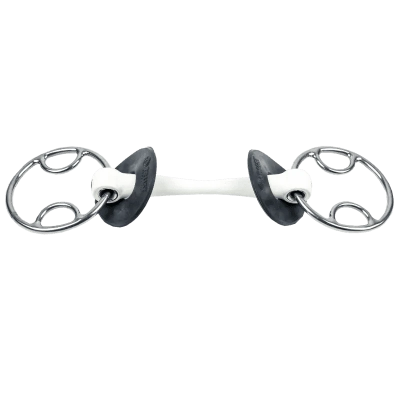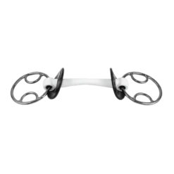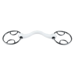 This bit has two half rings in the cheekpiece which gives more control than normal rings. The beval has several options for attaching the reins so you can decide how much pressure you want to apply. The cheekpiece is attached to the upper half ring and the reins can be attached to the large ring or to the lower half ring. By attaching the reins to the large ring, pressure is applied to lower the head. When the reins are attached to the lower half ring, the bit has a light leverage for better responsiveness.