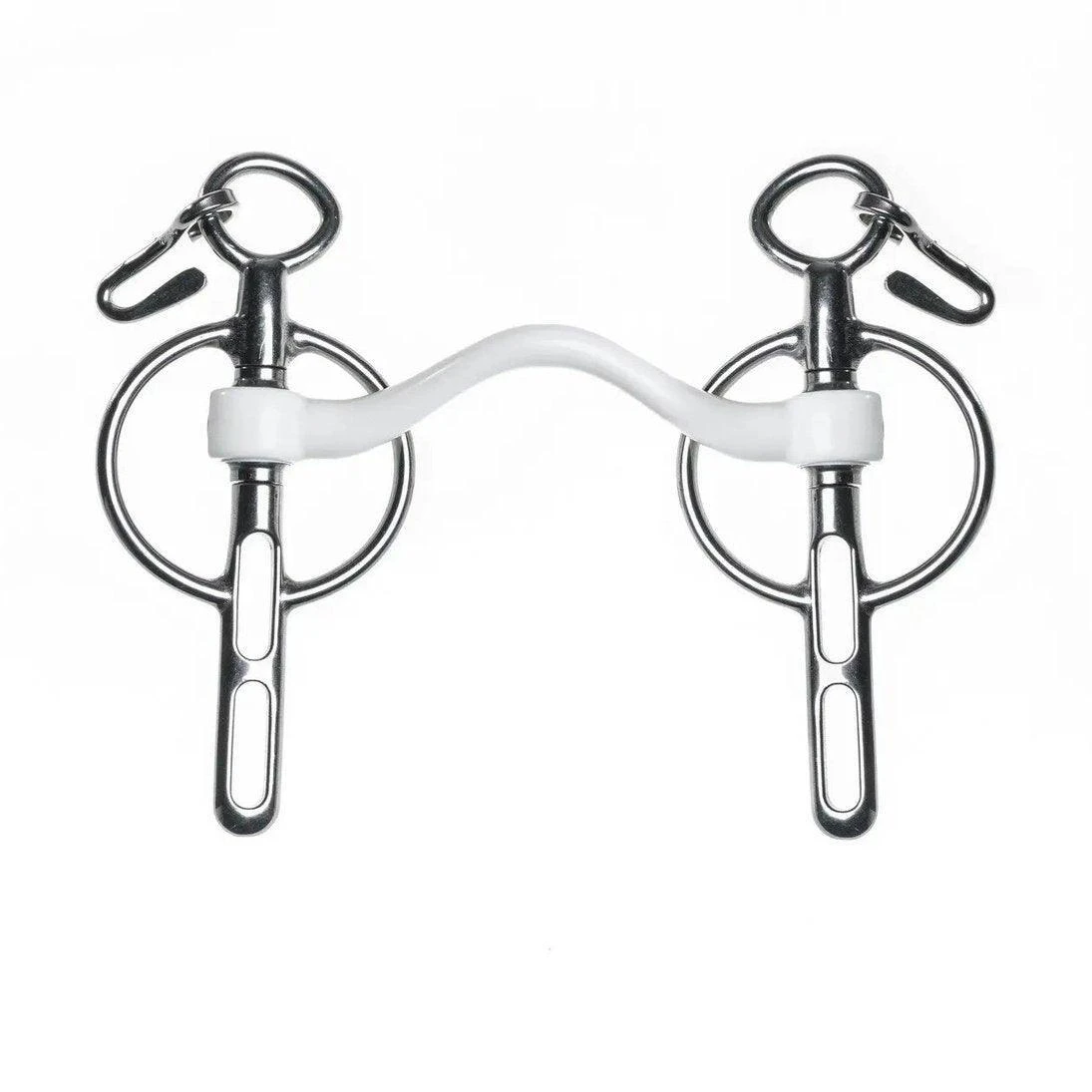 The Inno Sense Mullen is a straight bar that slightly bends forward. This mouthpiece is fabricated of synthetic material. The bit has a rigid core that makes the mullen bar not flexible but the material around it gives the bit a soft touch.