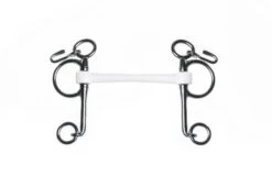 The pelham cheekpiece combines the effect of a snaffle and a double bridle. The bit has one cheekpiece but can be ridden with one or two reins. If you choose to ride with one rein, a pelham strap is needed to connect the bit rings to the rings of the shanks. The longer the shanks, the sharper the effect. The baby pelham has short shanks and therefore is less sharp than the normal pelham. A pelham bit is mainly used with strong horses, horses with too little space in the mouth for two mouthpieces or horses that have to get used to a double bridle. This bit is not suitable for the inexperienced rider.