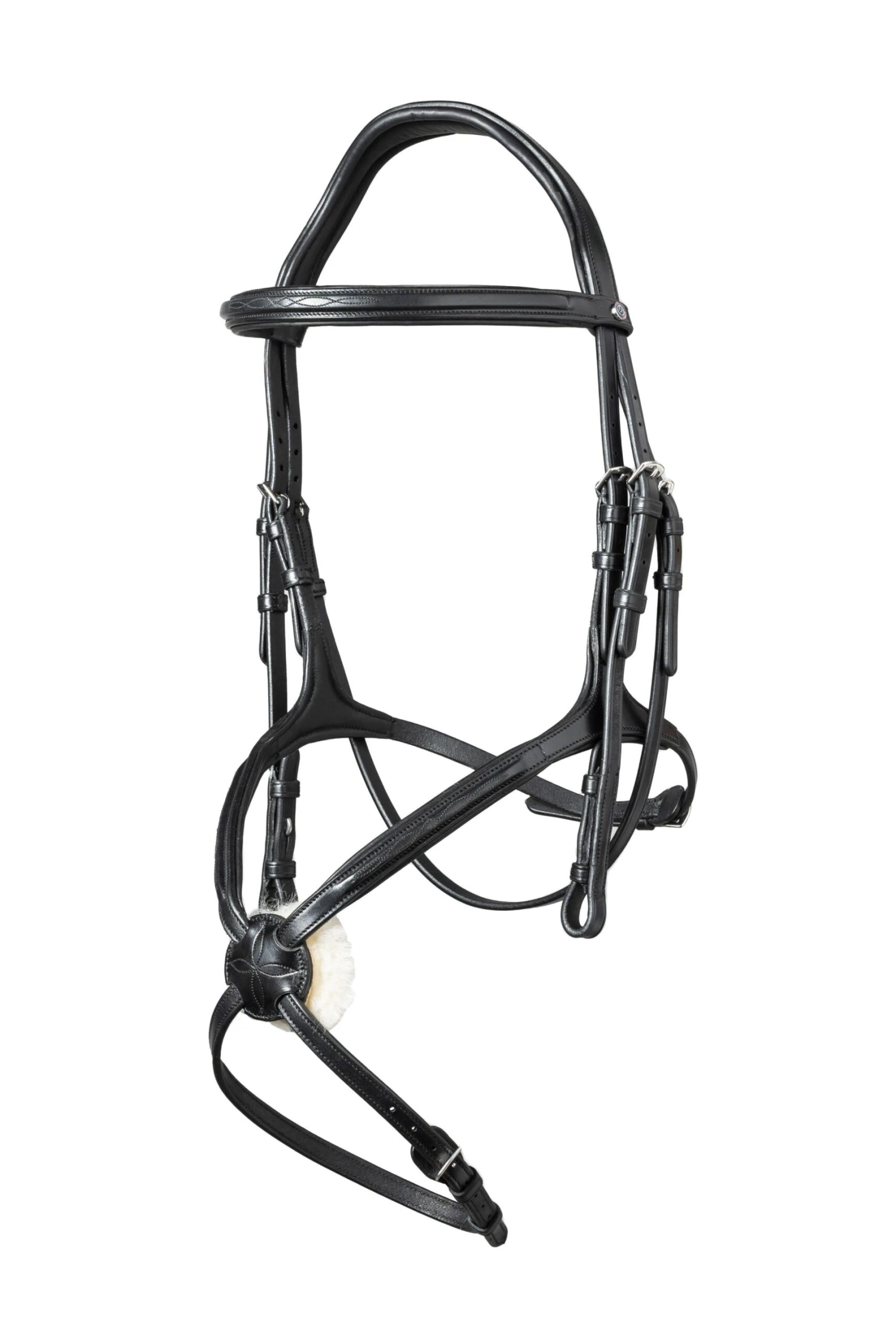 The TRUST Oslo has a Mexican noseband with sheepskin on the nose, which ensures a different pressure distribution. The headpiece is anatomically shaped and cut back for more freedom at the ears. The padding of the headpiece is soft but not too thick so that there is direct contact is with horse The TRUST Oslo has a beautiful decorative stitching on both the browband and the noseband.