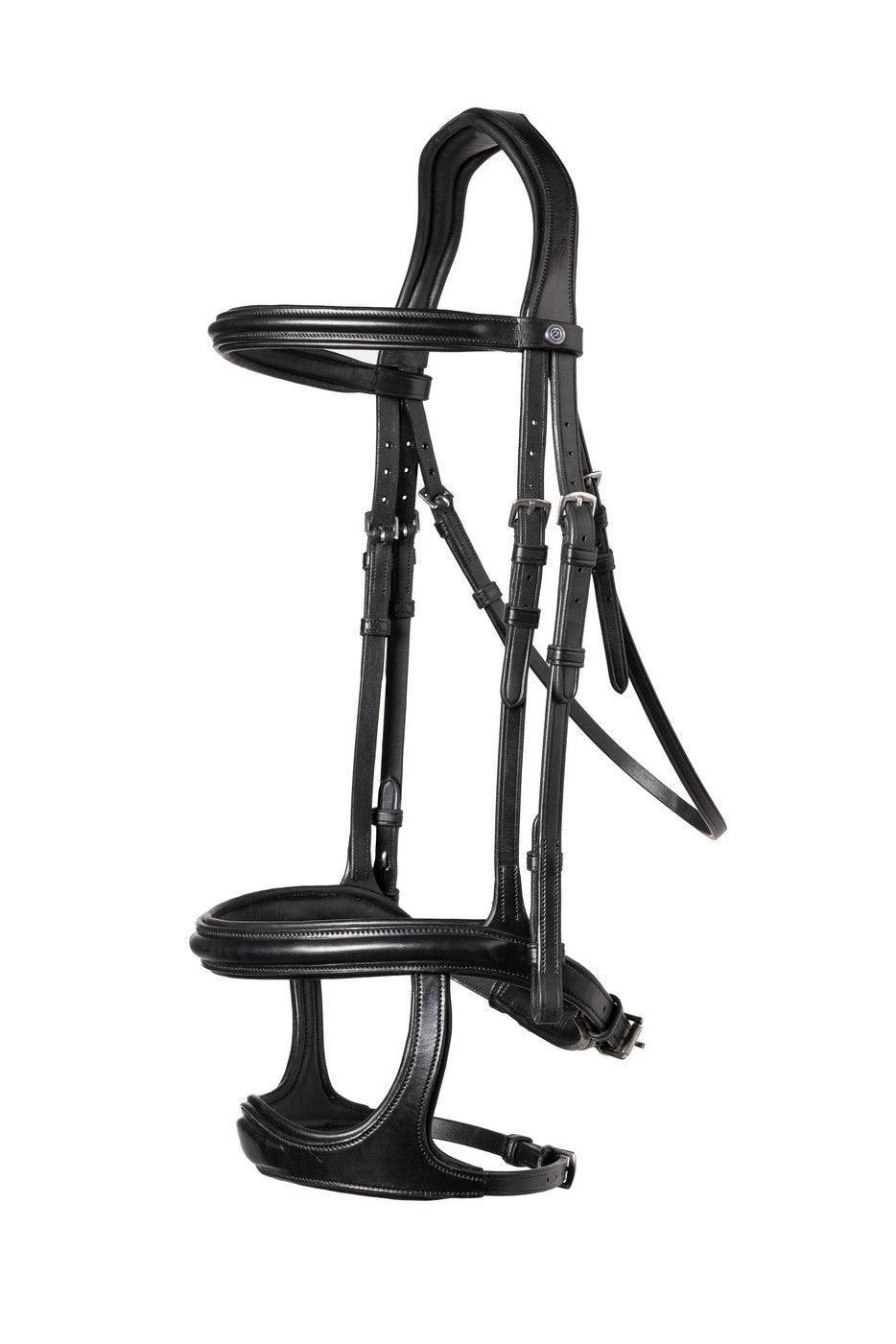 The TRUST Paris is the popular bridle with the double noseband. The double noseband provides a different pressure distribution than the classic noseband. The upper and lower noseband are softly padded. The lower noseband is slightly raised, which means that the noseband is slightly raised. to ensure that it lies softly on the horse’s nose. The lower noseband has a buckle protector so that the buckle never touches the horse’s nose. The headpiece is anatomically shaped and cut back for more freedom at the ears. The padding of the headpiece is soft but not too thick so that there is direct contact with the horse.