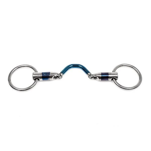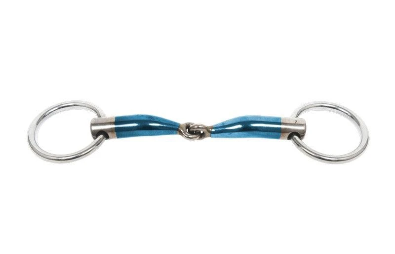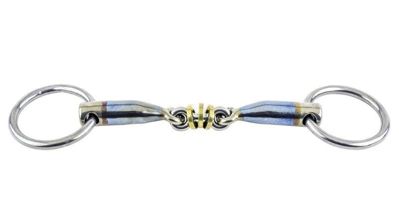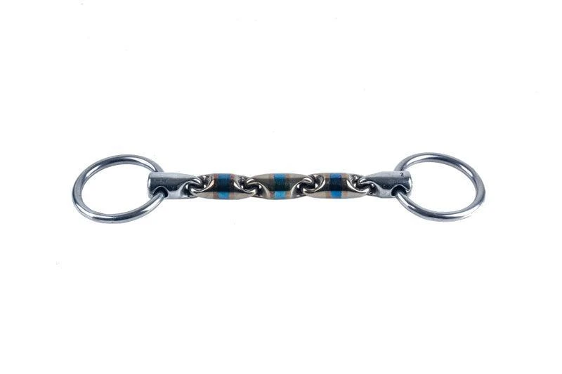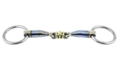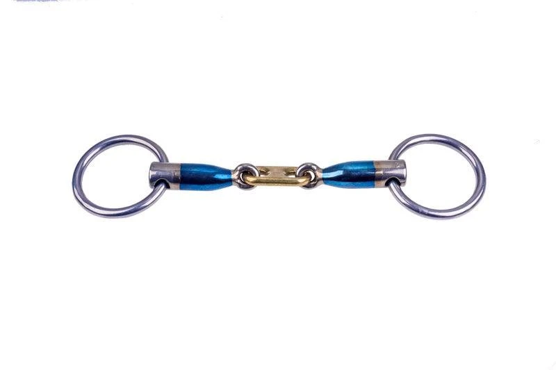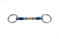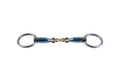 The mouthpiece with brass rings is a variant of the double-jointed bit. The rings in the middle stimulate the horse to play with the bit. This increases the tongue activity so that the horse will produce more saliva and the jaws can relax more.