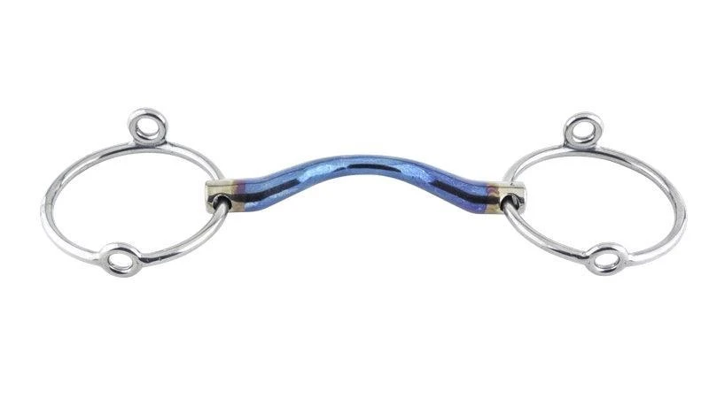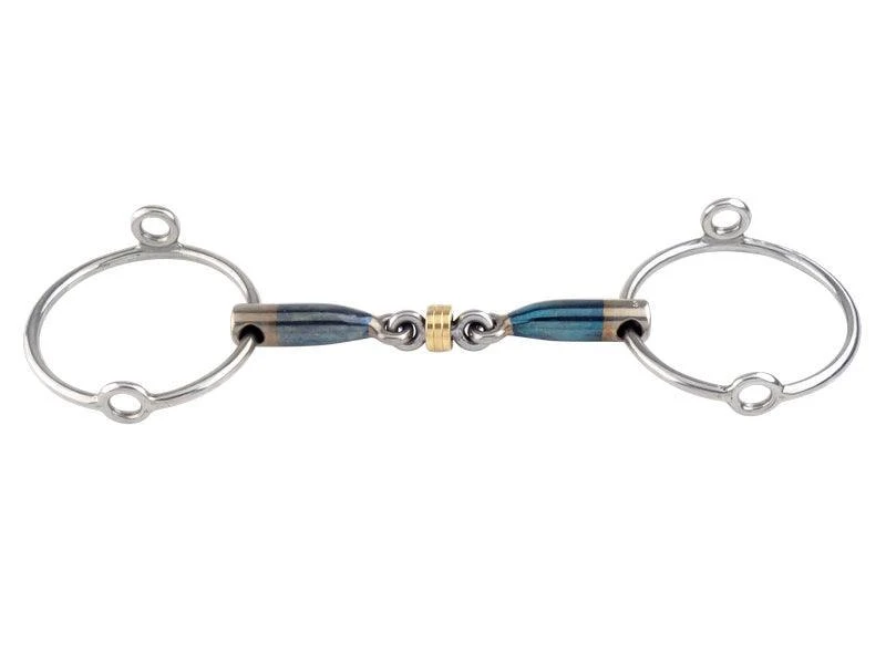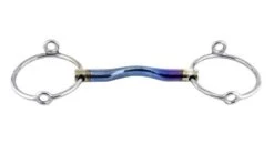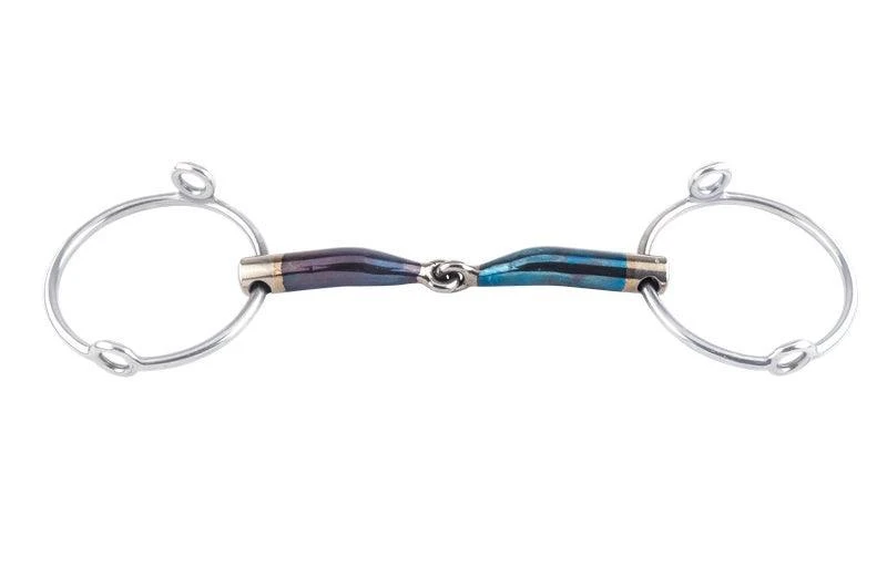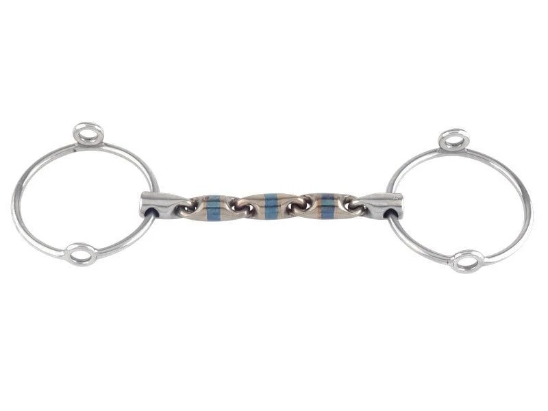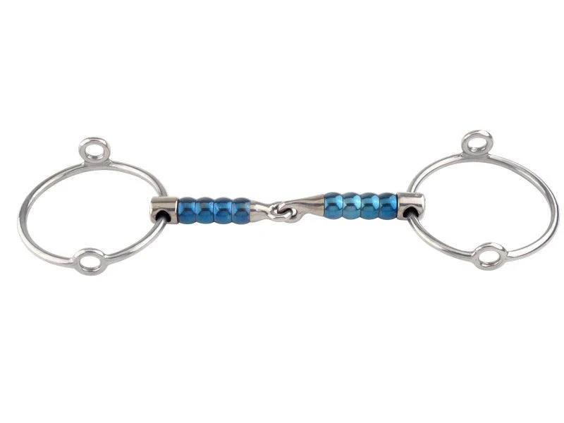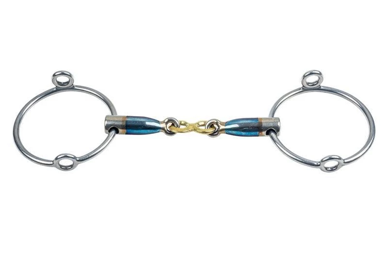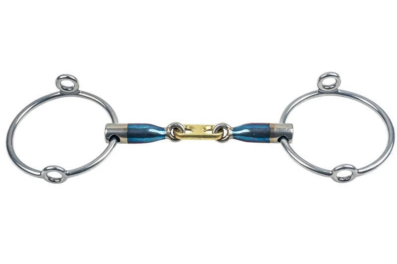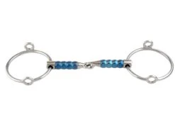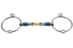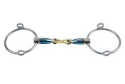 The mouthpiece with brass rings is a variant of the double-jointed bit. The rings in the middle stimulate the horse to play with the bit. This increases the tongue activity so that the horse will produce more saliva and the jaws can relax more.